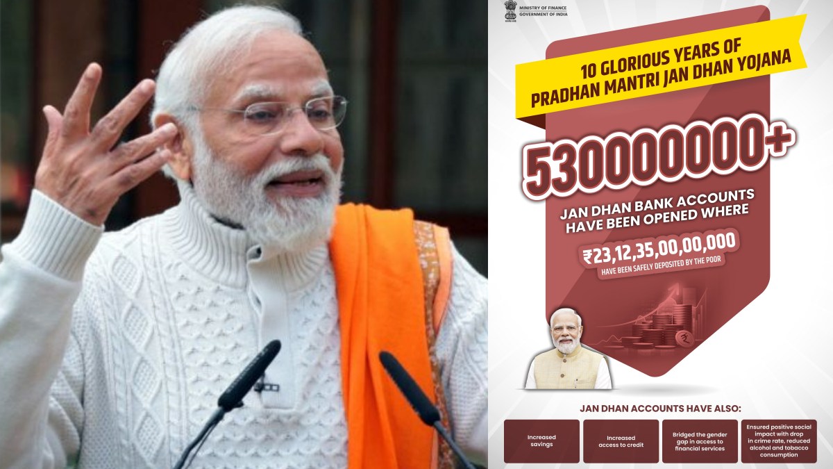 இந்தியாவில் உள்ள அனைவருக்கும் வங்கி சேவை மற்றும் நிதியுதவி கிடைக்க வேண்டும் என்பதற்காக மத்திய அரசு கொண்டு வந்த திட்டம் தான் பிரதான் மந்திரி ஜன்-தன் யோஜனா வங்கி கணக்குகள். பிரதான் மந்திரி ஜன் தன் யோஜனா (PMJDY) இன்று ஒரு புதிய மைல்கல்லை எட்டியுள்ளது. இந்தத் திட்டம் தொடங்கப்பட்டதில் இருந்து இன்றோடு 10 ஆண்டுகளை நிறைவு செய்துள்ளது. இதையடுத்து பிரதமர் நரேந்திர மோடி, பயனாளிகளுக்கு சமூக வலைதளங்களில் வாழ்த்து தெரிவித்துள்ளார்.