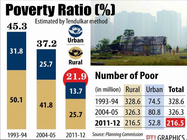 1993-94 ஆம் ஆண்டின் வறுமை கோட்டிற்கு கீழ் இருக்கும் மக்களின் கணக்கெடுப்பில், கிராமப்புறத்தில் 328.8 மில்லியன் மக்களும் (50.1%) , நகர்ப்புறத்தில் 74.5 மில்லியன் மக்களும் (31.8%) இருந்தனர். இதன் முலம் வறுமை கோட்டிற்கு கீழ் இருக்கும் மக்கள் 45.3 சதவிதமாகும்.