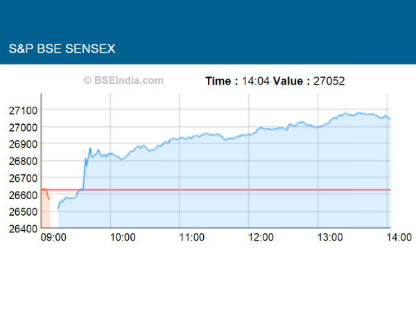 இன்று காலை 26,516 புள்ளிகளில் துவங்கிய மும்பை பங்கு சந்தையின் வர்த்தகம் 27,084.05 என்ற புள்ளிகள் வரை உயர்ந்தது. மேலும் இன்றைய வர்த்தகத்தில் பெரும் அளவில் எந்த வித சரிவும் இல்லாமல் சிறப்பாக உள்ளது குறிப்பிடதக்கது.மதிய 3 மணியளவில் மும்பை பங்கு சந்தை 27,000 வரை உயர்ந்து கடந்த நான்கு நாள் கண்ட சரிவை சமன் செய்தது. மும்பை பங்கு சந்தையை போலவே நிஃப்டியும் 8100 என்ற புதிய உயரத்தை எட்டியுள்ளது. இன்றைய வர்த்தகத்தில் மட்டும் சுமார் 124.35 புள்ளிகள் உயர்ந்ததுள்ளது. மும்பை பங்கு சந்தையின் தகவல் படி இன்றைய வர்த்தகத்தில் கட்டுமான நிறுவனங்களான யூனிடெக், ஹெச்.டி.ஐ.எல், ஐபி ரியல் எஸ்டேட் போன்ற நிறுவனங்களின் பங்குகள் அதிகப்படியாக உயர்ந்துள்ளது. இதற்கு முக்கிய காரணம் சீன அரசின் கட்டுமான சார்ந்த முதலீட்டு திட்டங்கள் என்பது நிதர்சனமான உண்மை. முதலீட்டாளர்கள் கட்டுமான மற்றும் உற்பத்தி நிறுவனங்களின் மீது கவனத்தை செலுத்தி வருவதால் மருந்து உற்பத்தி, உணவு பொருடகள் உற்பத்தி, கப்பல் கட்டுமான துறை சார்ந்த நிறுவனங்களின் பங்குகள் கடுமையான சரிவை சந்தித்துள்ளது.