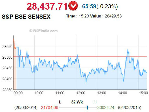 வாரத்தின் முதல் வர்த்தக நாளான இன்று சென்செக்ஸ் குறியீடு 4 மணியளவில் 65.57 புள்ளிகள் சரிவைடைந்து 28,422 புள்ளிகளை எட்டியுள்ளது. மேலும் இன்றைய வர்த்தகத்தில் முக்கிய நிறுவனங்கள் அனைத்தும் சரிவை சந்தித்தது. இதில் டிசிஎஸ், ஏர்டெல், ஹெச்டிஎஃப்சி, ஐடிசி ஆகிய நிறுவனங்களும் அடக்கம்.