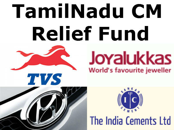 இந்நிலையில் சென்னையை மையமாகக் கொண்டு இயங்கும் டிவிஎஸ், இந்தியா சிமென்ட்ஸ் போன்ற பல நிறுவனங்கள் முதலமைச்சர் நிவாரண நிதிக்குக் கோடிக்கணக்கில் நிவாரண நிதியை அளித்துள்ளனர். வாங்க யார் யார் எவ்வளவு கொடுத்தாங்கனு பார்ப்போம்..