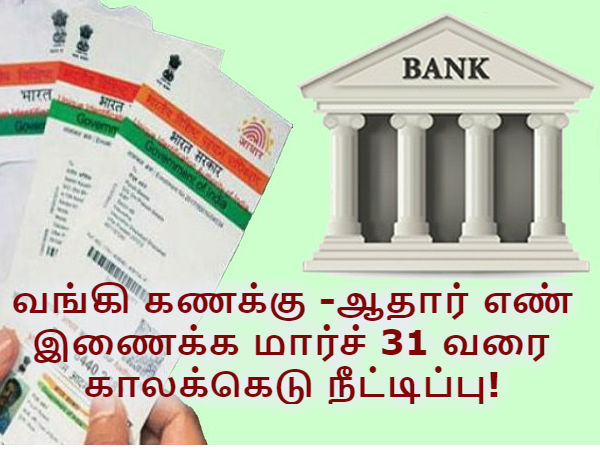 சென்ற வாரம் மத்திய அரசு பான் எண்ணுடன் ஆதார் எண்ணை இனைக்க இருந்த கடைசித் தேதியினை 2018 மார்ச் 31 வரை நீட்டித்த நிலையில், தற்போது வங்கி கணக்குடன் ஆதார் எண்ணை இணைக்கும் தேதியையும் 2018 மார்ச் 31-ம் தேதிக்குள் செய்யச் செய்ய வேண்டும் என்றும் அறிவித்துள்ளது.