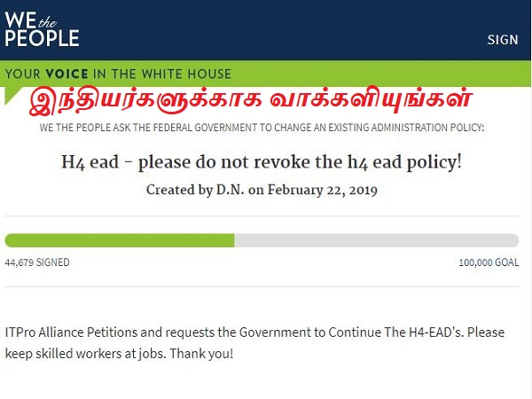 அதனால் ஹெச் 4 விசாவுக்கு EAD (employment authorisation document) ரத்து செய்யும் வரைவு மசோதாவை எதிர்த்து அமெரிக்க வெள்ளை மாளிகையின் வலைதளத்தில் ஒரு பெட்டிஷனைத் தொடங்கி இருக்கிறார்கள் இந்தியர்கள். மார்ச் 08-ம் தேதி மாலை 5 மணி நிலவரப்படி இந்த பெட்டிஷனில் 55,321 பேர் கையெழுத்து போட்டிருக்கிறார்கள்.