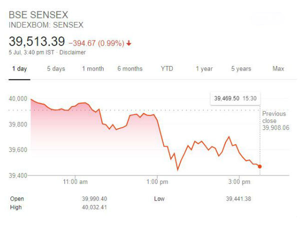 குறிப்பாக மும்பை பங்கு சந்தையின் சென்செக்ஸ் 395 புள்ளிகள் குறைந்து 39,513 ஆக முடிவடைந்துள்ளது. இதுவே தேசிய பங்கு சந்தை நிஃப்டி 135 புள்ளிகள் குறைந்து 11,811 ஆக முடிவடைந்தது குறிப்பிடத்தக்கது.
