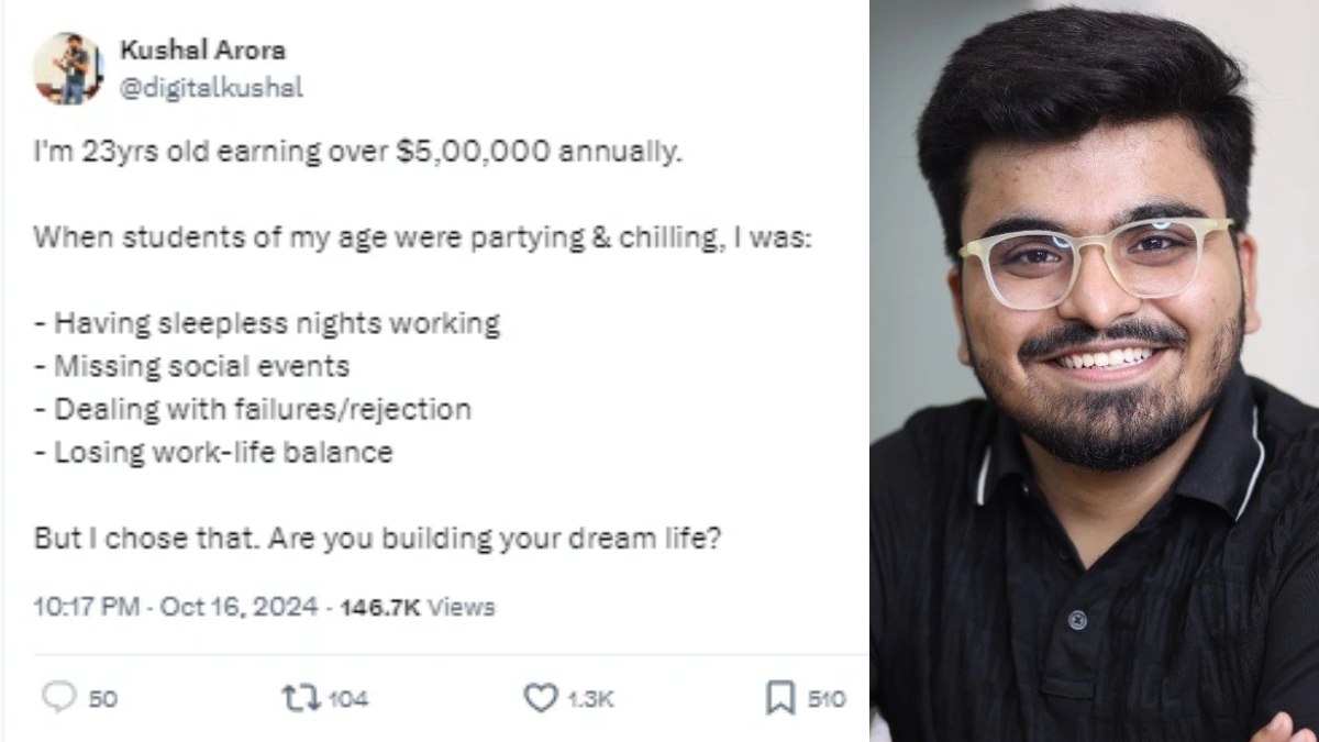 தனது X பதிவில் "எனக்கு 23 வயதாகிறது, ஆண்டுக்கு $5,00,000க்கும் அதிகமாக சம்பாதிக்கிறேன். என் வயதில் உள்ள மாணவர்கள் ரிலாக்ஸ் செய்துகொண்டிருந்தபோது, நான் தூக்கமில்லாமால் இரவுகளிலும் உழைத்தேன், சமூக நிகழ்வுகளை தவிர்த்தேன், தோல்விகளுடன் போராடி, இந்த நிலையை அடைந்திருக்கிறேன். நீங்கள் உங்கள் கனவு வாழ்க்கையை உருவாக்கி கொண்டிருக்கிறீர்களா?" என்ற கேள்வியுடன் பதிவிட்டிருந்தார்.