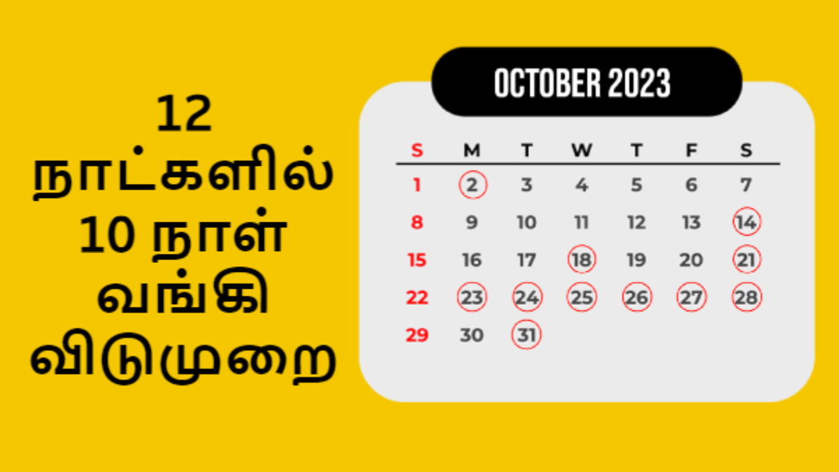அக்டோபர் 2023 இல் இன்னும் எட்டு வங்கி விடுமுறைகள் உள்ளன. அக்டோபர் மாதத்திற்கான இந்திய ரிசர்வ் வங்கியின் விடுமுறை பட்டியலின்படி, துர்கா பூஜை, தசரா மற்றும் பல்வேறு பண்டிகைகள் மற்றும் இதர நிகழ்வுகளுக்காக வங்கிகளும், வங்கி கிளைகளும் மூடப்படும்.