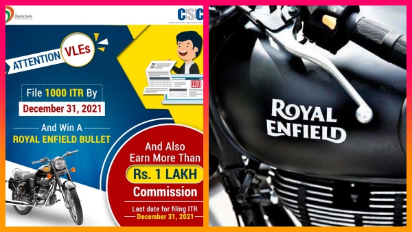 ஆம் எப்போதும் இல்லாமல் வகையில் வருமான வரி செலுத்துவோர் எண்ணிக்கை அதிகரிக்கப் பொதுச் சேவை அமைப்பு (CSC) 1000 பேருக்கு டிசம்பர் 31ஆம் தேதிக்குள் வருமான வரி தாக்கல் செலுத்தும் கிராம அளவு தொழிலதிபர்களுக்கு ராயல் என்பீல்டு பைக் வெல்லும் வாய்ப்பை பெறுவார்கள் என அறிவித்துள்ளது.