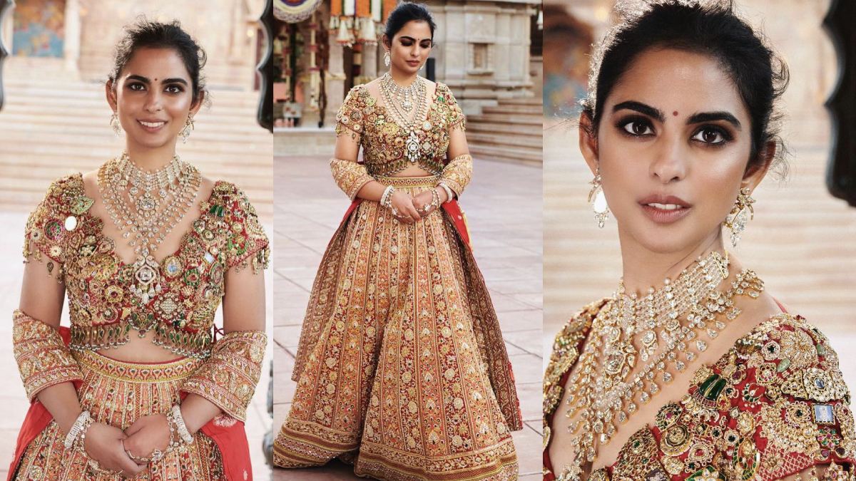 ஈஷா அம்பானி மிகவும் புதுமையாக வைரம், மரகதம், மாணிக்கக் கற்கள் உள்ளிட்ட பல விலைமதிப்பற்ற கற்கள் அடங்கிய ஜடாவ் நகைகளால் செய்யப்பட்ட ஜாக்கெட் அணிந்திருந்தார்.