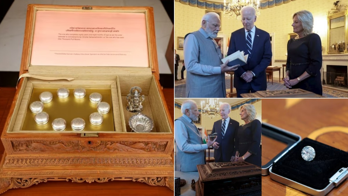 மோடி ஜோ பைடன்-க்கு சந்தனப் பெட்டியில் வெள்ளி விநாயகர் சிலை, வெள்ளி விளக்கு மற்றும் 80 வயதானதை உணர்த்தும் வகையில் 1000 பௌர்ணமி கண்டவர்களுக்கு அளிக்கப்படும் 'தாஸ் தானம்' ஆகியவை அடங்கிய பெட்டியை பரிசாக கொடுத்தார்.