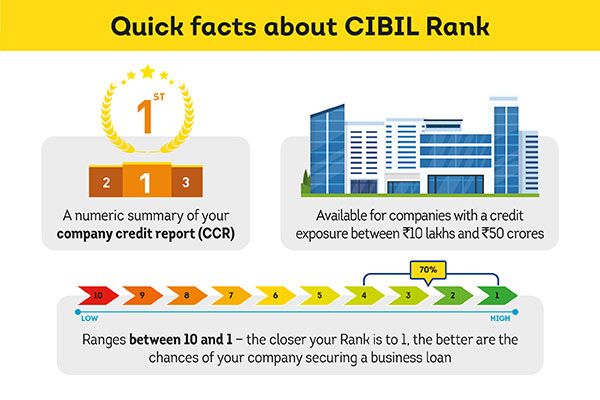 இந்தியாவின் முன்னணி கடன் தரவு நிறுவனமான டிரான்ஸ்யூனியன் சிபில் (TransUnion CIBIL) அமைப்புச் சிபில் ரேங்கிங் மற்றும் நிறுவன கிரெடிட் ரிப்போர்ட் (CIBIL Rank and Company Credit Report - CCR) வழங்குகிறது. இது கடன் மற்றும் நிதியுதவிகளைப் பெறுவதற்கான CCR அளவீட்டைக் கணக்கிட்டு 1 முதல் 10 என்ற அடிப்படையில் மதிப்பீட்டைக் கொடுக்கிறது. இதில் 1 மதிப்பீடு என்பது சிறப்பான ரேங்க் என்பது பொருள்.