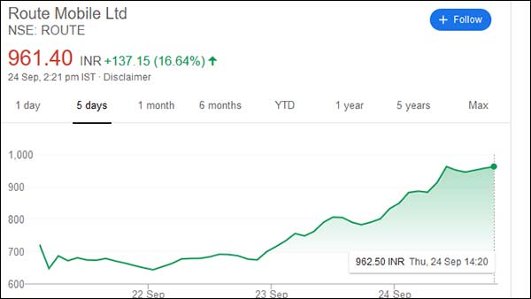 புதிதாக பங்கு சந்தையில் பட்டியிலிடப்பட்ட ரூட் மொபைல் பங்கு விலையானது, இன்று 16.24% ஏற்றம் கண்டு 961 ரூபாயாக காணப்படுகிறது.