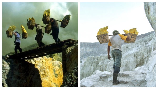 பெரும்பாலான சுரங்கத்தொழிலாளர்கள் தங்கள் உயிரைப் பணயம் வைத்து சுரங்கத்திற்குள் சென்று இரண்டு கூடைகள் அதாவது 200 பவுண்டு கந்தகத்துடன் வெளியே வரவேண்டும் என்பது தான் அவர்களுக்கு கொடுக்கப்பட்ட வேலை. இந்தோனேசியாவில் உள்ள இந்த எரிமலை சுரங்கத்திற்குள் கந்தகத்தை எடுக்கும் ஊழியர்கள் நூற்றுக்கணக்கில் வேலை செய்வதை காணலாம்.