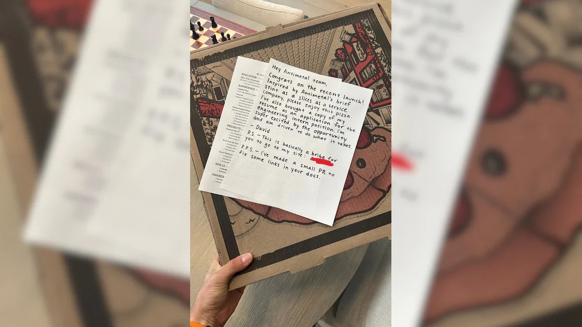 அதில் Antimetal நிறுவனத்தில் பொறியியல் துறையில் இன்டர்னாக பணிக்கு சேர வேண்டும் என்பதற்காகவே இந்த விண்ணப்பத்தை அனுப்பி வைப்பதாகவும், இந்த பீட்சாவை ஒரு லஞ்சமாக அனுப்பி வைக்கிறேன் என்றும் இதனை ஏற்றுக் கொண்டு என்னுடைய இணையதள பக்கத்தையும் அதில் நான் குறிப்பிட்டுள்ள என்னுடைய வேலைகள் சார்ந்த தகவல்களையும் பார்க்குமாறு கேட்டுக்கொள்கிறேன் என எழுதி அனுப்பியிருக்கிறார்.