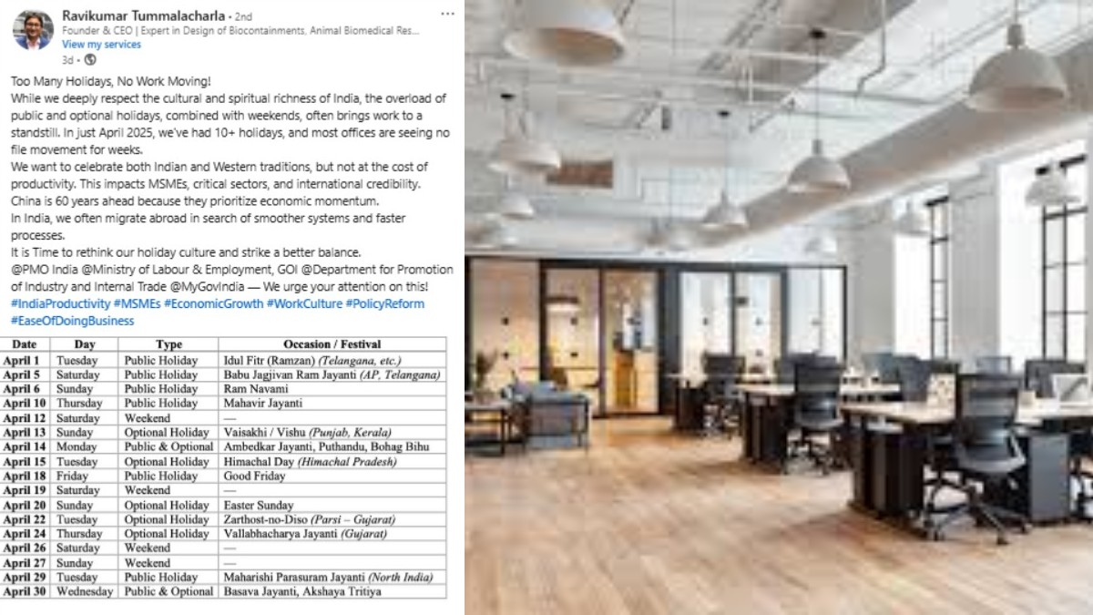 Cleanrooms Containments என்ற நிறுவனத்தின் தலைமை செயல் அதிகாரி பொறுப்பில் இருப்பவர் ரவிக்குமார் தும்மலச்சாரா. இவர் இந்தியாவில் அதிக எண்ணிக்கையில் விடுமுறை நாட்கள் இருப்பதாக குறிப்பிட்டு இருக்கிறார். தன்னுடைய லிஙகுடின் பக்கத்தில் இது தொடர்பாக பதிவு செய்திருக்கும் ரவிக்குமார் ஏப்ரல் மாதத்தில் இருக்கும் விடுமுறை நாட்களை சுட்டிக்காட்டியுள்ளார். இந்த விடுமுறை நாட்கள் காரணமாக பல்வேறு துறைகளிலும் உற்பத்தி திறன் பாதிக்கப்பட்டு இருப்பதாக குறிப்பிட்டுள்ளார்.
