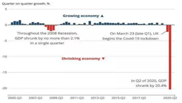 புதன்கிழமை பிரிட்டன் நாட்டின் தேசிய புள்ளியியல் அமைப்பு அந்நாட்டுப் பொருளாதார வளர்ச்சி ஆய்வுகளை வெளியிட்டது. இதில் 2020ஆம் ஆண்டின் 2வது காலாண்டில் யாரும் எதிர்பார்க்காத வகையில் பிரிட்டனின் ஜிடிபி சுமார் -20.4 சதவீத (எதிர்மறை) வரையில் சரிந்துள்ளதாக அறிவித்துள்ளது.