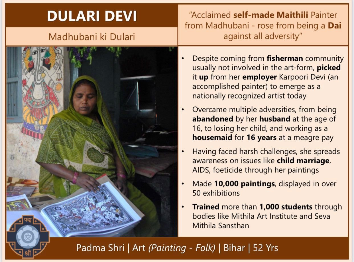 மத்திய நிதியமைச்சர் நிர்மலா சீதாராமன் மதுபானி கலை மற்றும் பத்ம விருது பெற்ற துலாரி தேவியின் திறமையை போற்றும் வகையில் சேலை அணிந்துள்ளார்.