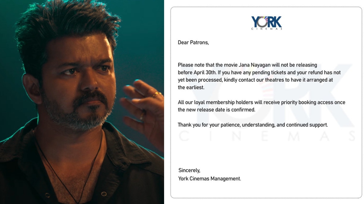 படம் பிப்ரவரி மாதத்தில் வெளியாகும் என்று பலரும் நம்பிக் கொண்டு இருக்கையில் திடீரென வந்து விழுந்துள்ளது ஒரு அதிகாரப்பூர்வ அறிவிப்பு. அதாவது கனடாவில் படத்தை ரிலீஸ் செய்யும் யோர்க் சினிமாஸ் நிறுவனம் தனது அதிகாரப்பூர்வ எக்ஸ் தளத்தில் ஜன நாயகன் படம் ஏப்ரல் 30ஆம் தேதி வரை இங்கு ரிலீஸ் ஆகாது. எனவே இதுவரை டிக்கெட் முன்பதிவு செய்து அதற்கான பணத்தை திரும்பப் பெறாதவர்கள் தயவு செய்து பணத்தை திரும்பப் பெற்றுக் கொள்ளுங்கள். இது தொடர்பாக தியேட்டரிலும் சென்று விசாரிக்கலாம். படத்தின் ரிலீஸ் தேதி அறிவிக்கப்பட்டதும், நமது மெம்பர்ஷிப் வைத்திருப்பவர்களுக்கு டிக்கெட் முன்பதிவில் முன்னுரிமை அளிக்கப்படும்” என்று குறிப்பிடப்பட்டுள்ளது.